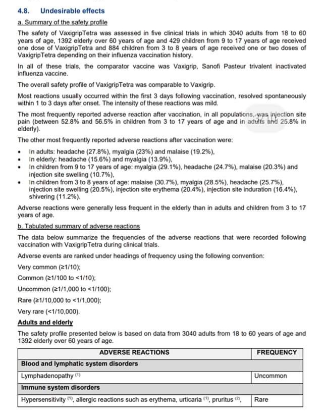 The most frequently reported local adverse reaction after vaccination with influvac tetra in all age groups was pain at injection site in all age groups (16.3% in adults 18 years of age and older, and 59.0% in children). 6 mois à 36 mois : 0,5 ml, 1 ou 2 doses à un mois d’intervalle en primovaccination, 1 dose en rappel annuel; A partir de 9 ans 0,5 ml, 1 dose 3 ans à 8 ans : 0,5 ml, 1 ou 2 doses à un mois d’intervalle en primovaccination, 1 dose en rappel annuel; May 06, 2021 · vaccins tétravalents fluarix tetra et vaxigrip tetra.